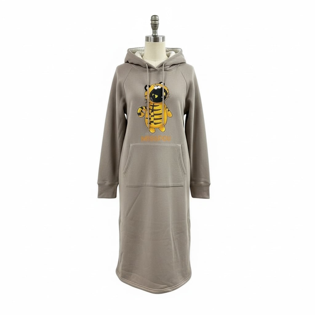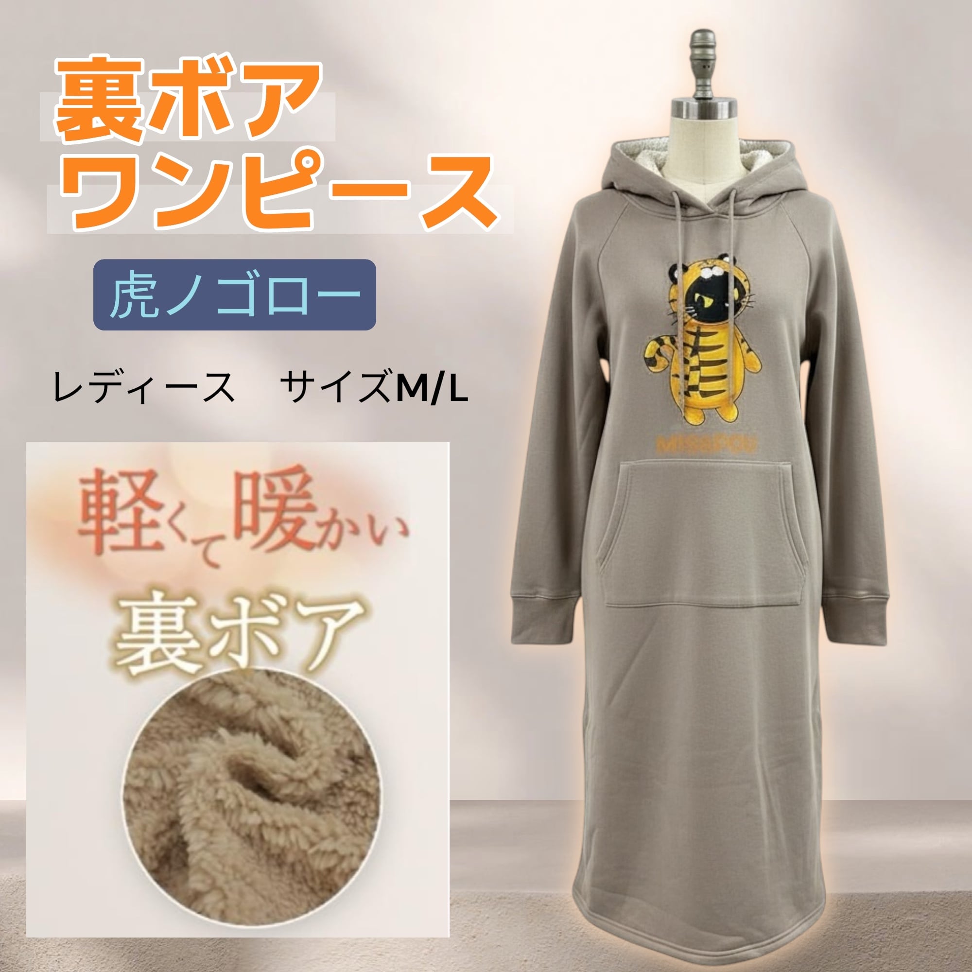 ついに入荷 レディース 2サイズ展開 裏ボア素材 虎ノゴロー あったかフード付きワンピース ベージュ