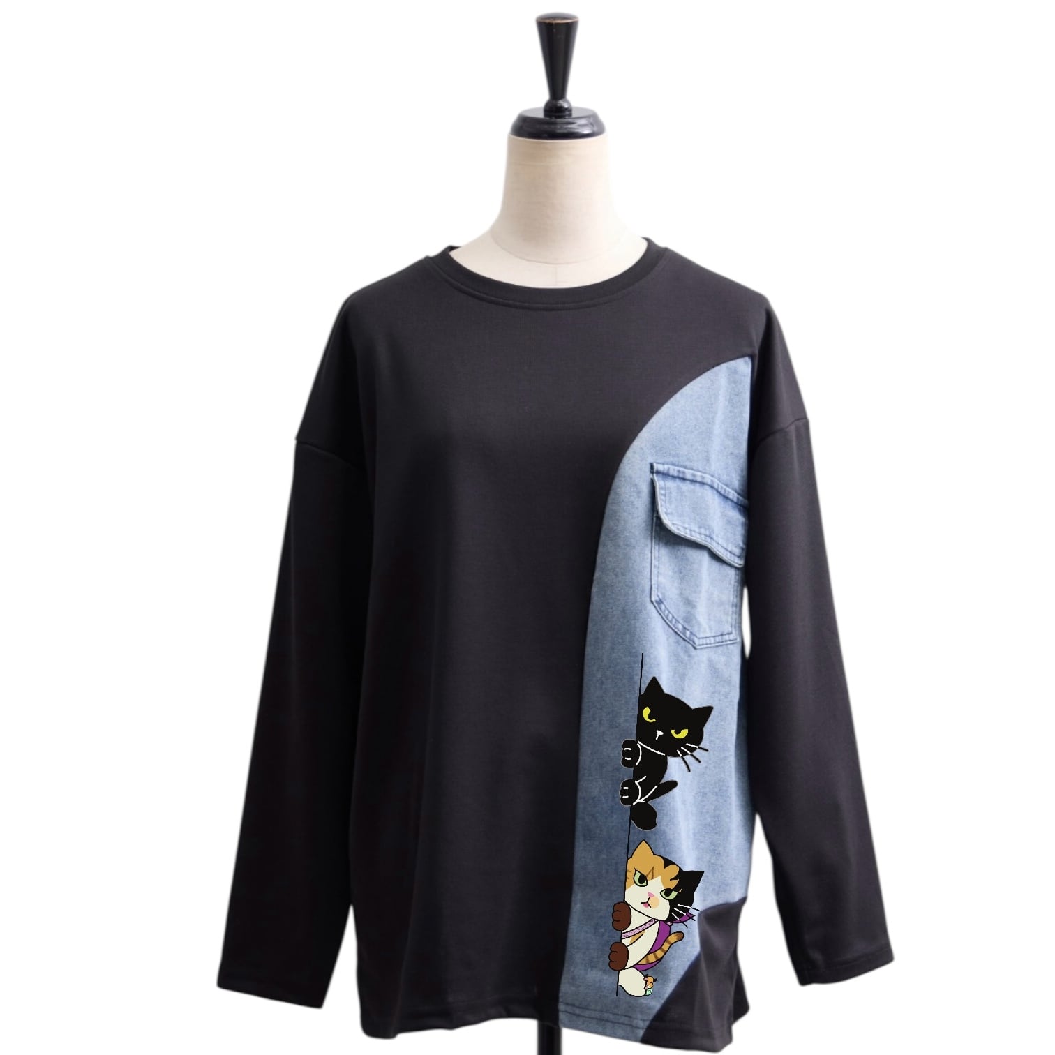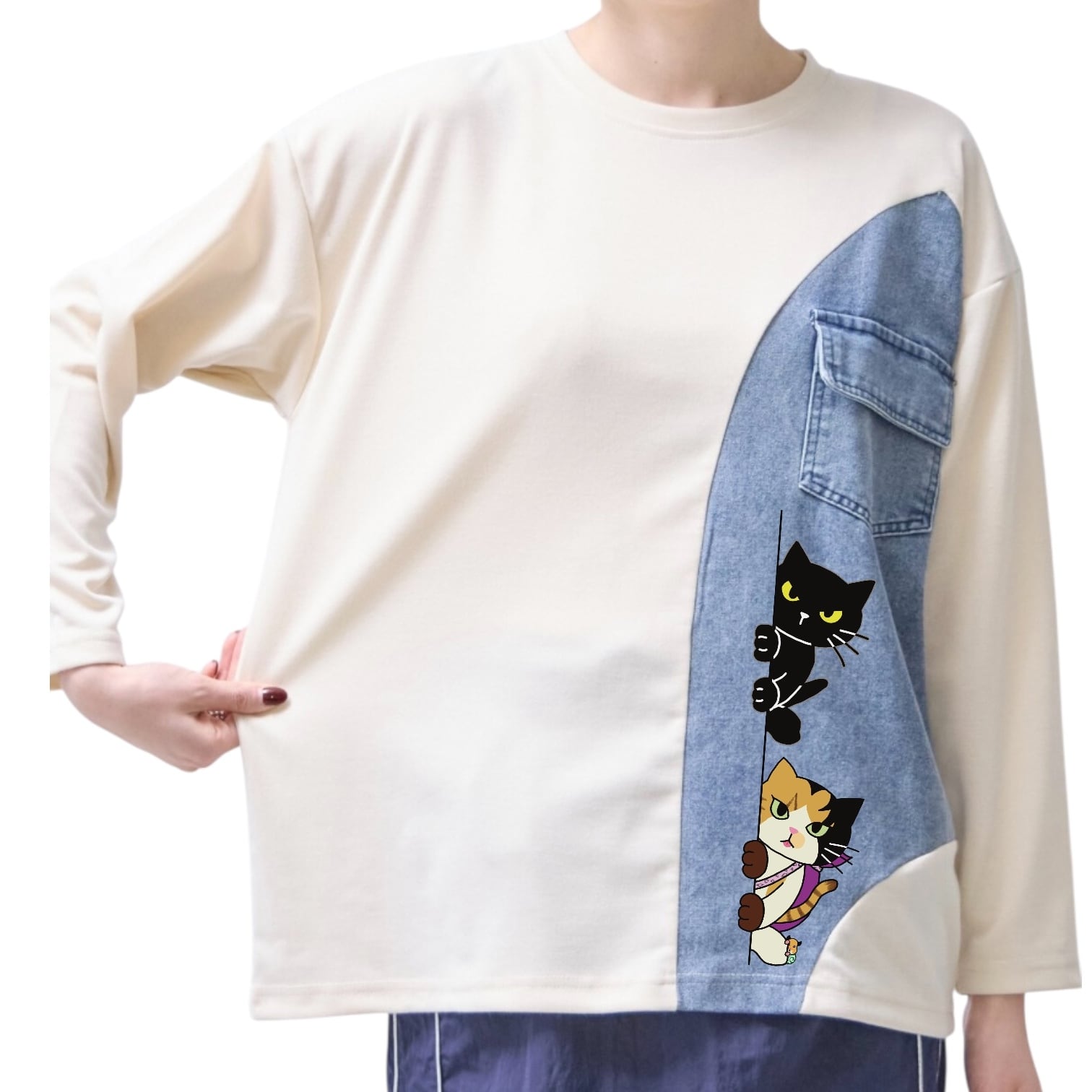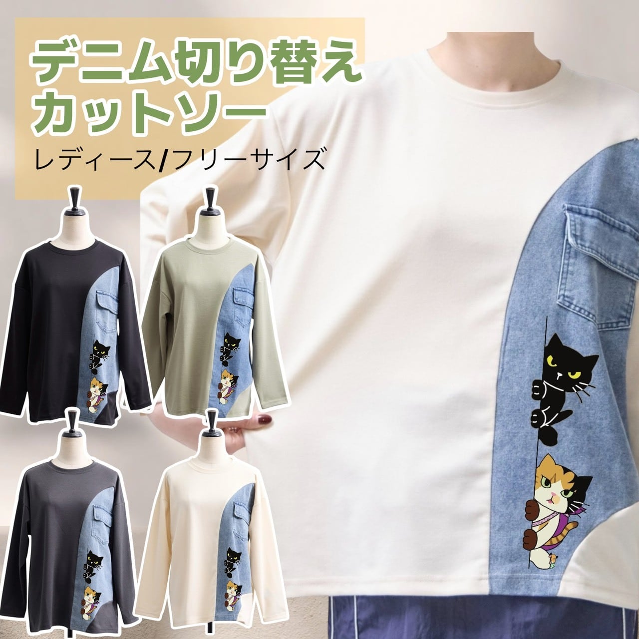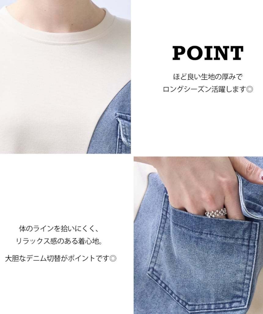 レディースフリーサイズ 4色展開 デニム切り替えカットソー