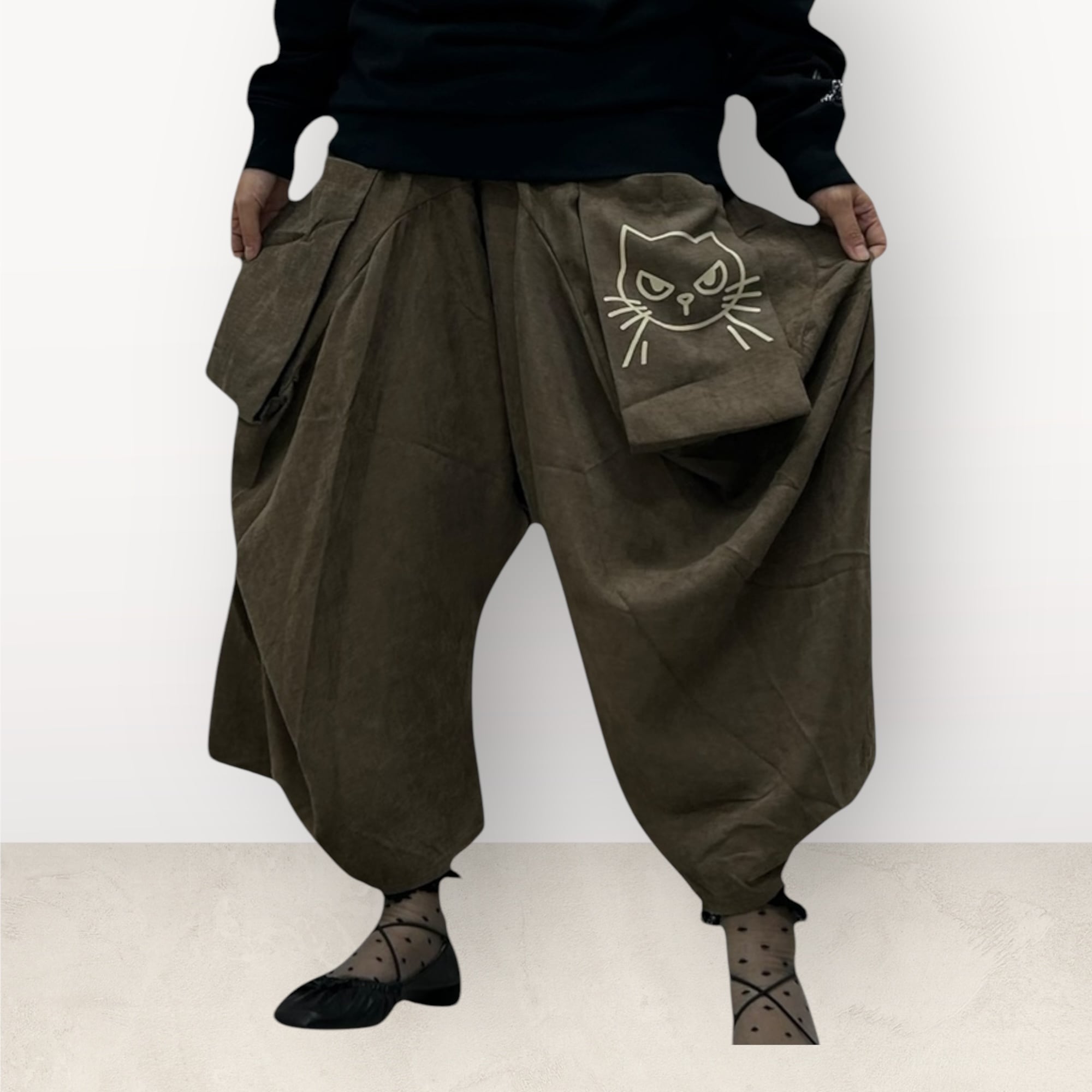 再入荷 レディースフリーサイズ 秋冬生地ピーチスキンフラップポケットサルエルパンツ キャメル