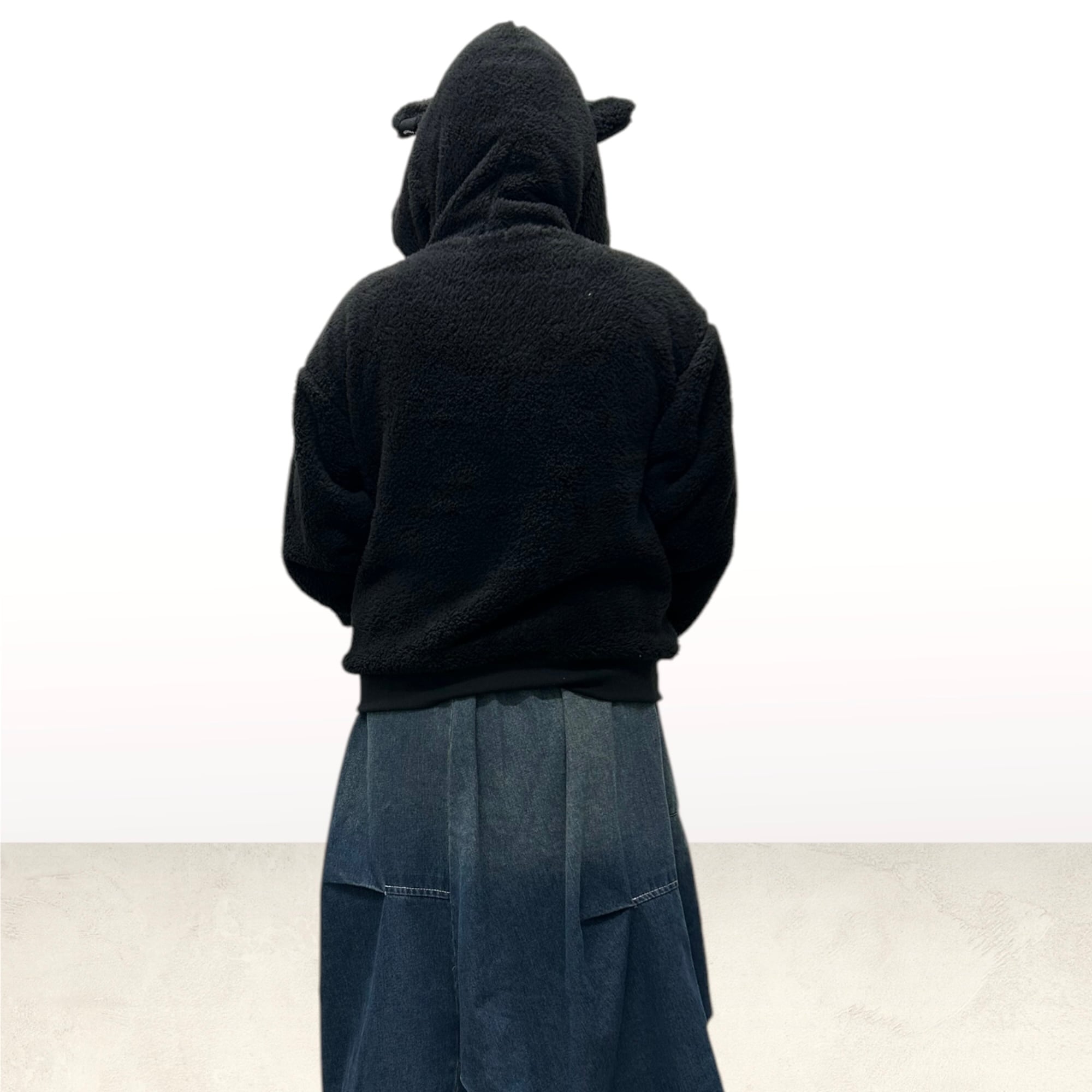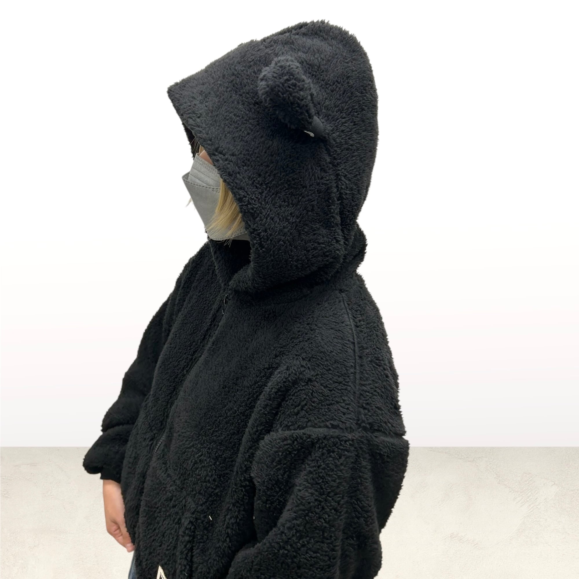 レディースフリーサイズ もこもこネコ耳フードzipパーカー ブラック